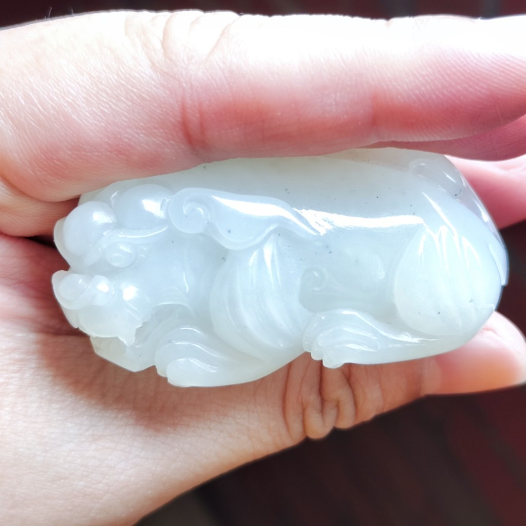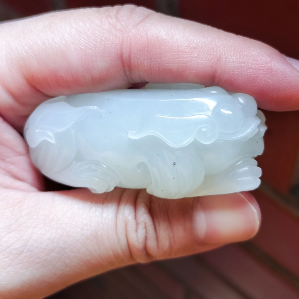 【貔貅】和田玉 俄料 白色帶青花 貔貅 小手把 手工雕