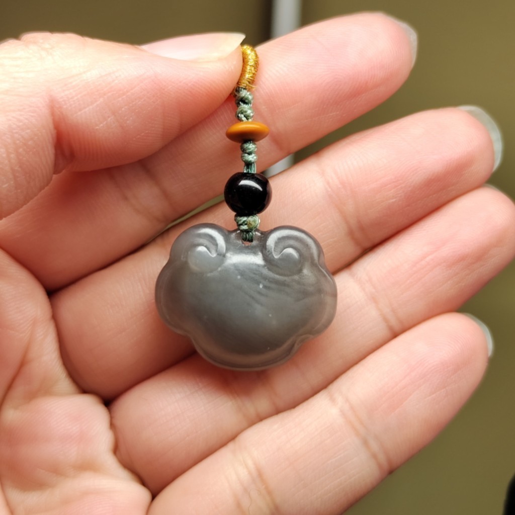 【掛墜擺件】和田玉 青海料 煙灰色 如意鎖 平安鎖 娃娃鎖 蛙鎖