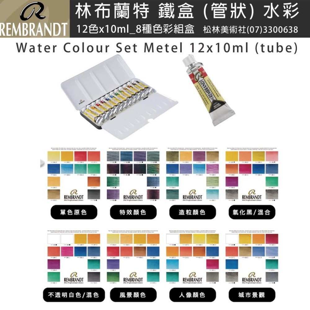 林布蘭特水彩顏料管狀鐵盒盒裝 8種不同顏色組盒 rembrandt water color set metal 特色: 質地細緻、色彩濃豔生動,可達到完美的透明度,且擁 有高強度的耐光性及持久性。可滿足專業畫家或各個 職業對水彩高品質的要求。 單色原色 #05830190 特效顏色 #05830191 造粒(沈澱色)顏色 #05830192 氧化黑/混合 #05830193 不透明白色/混色 #05830194 風景顏色 #05830195 人像顏色 #05830196 城市景觀 #105830197