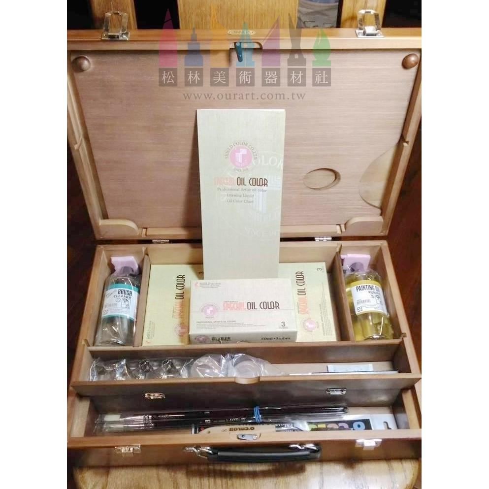 盾牌油彩50ml*12支 油壺(單小)*2個 老人牌調和油200ml*1罐 老人牌無臭洗筆液200ml*1罐 O'COLOR畫刀*1支 老人牌炭筆360*1盒 不鏽鋼畫夾/4入*1組 老人牌油畫筆 SX系列5支*1套 高級木製調色盤*1個 高級大畫箱*1個 #畫箱 #油畫 #JANUA #老人牌#盾牌