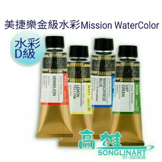 MISSION藝術家金級水彩 美捷樂水彩顏料mission artist's water colours gold class 藝術家金級水彩顏料, 容量:15ML 分為A,B,C,D,E,級數,色表如下,並標示透明/不透明/半透明/半不透明,可單購自選色,訂購專線07-3300638 特惠中,歡迎洽購 美捷樂Mission 水彩顏料 介紹:MIJELLO公司花了三年的時間,開發出最自然顏色的水彩顏料"MISSION"為了鮮明的顯色力及色彩,使用了世界最好、最安全的顏料,完全未使用鉛、鎘成分重金屬的顏料。MISSION水彩顏料沒有添加劑會刺激皮膚引起過敏的工業用防腐劑,而是使用化妝品用的防腐劑,來成就最好的水彩顏料。MISSION水彩顏料是使用德國、瑞士、英國、法國、義大利、日本等地所嚴選出最好的顏料,開發了最適合水彩畫特性的顏料,並用最先進的儀器,測試類太陽光的退色時間,開發出耐光性最好的顏料。專為水彩畫家所生產的藝術家級水彩顏料 推薦參考 MISSION金級水彩顏料D級,韓國 MIJELLO 美捷樂 MISSION 藝術家金級水彩 15ml (D級) 單色 #MISSIONwatercolor #美捷樂 #金級塊狀水彩顏料