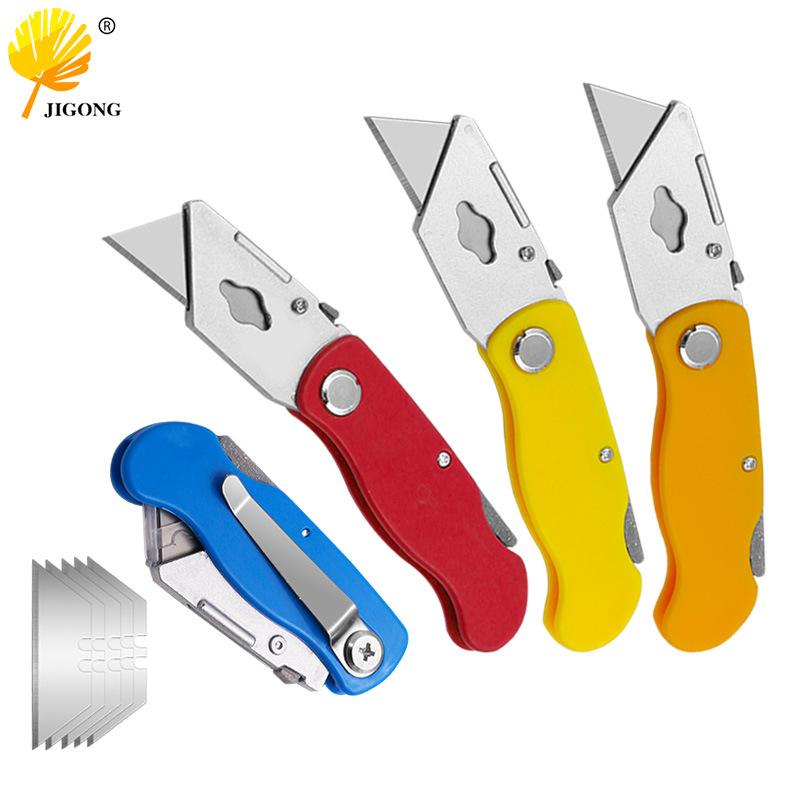 折疊式美工刀折疊刀 材質:ABS塑料+碳鋼刀片 重量:淨重48g,帶包裝61g。 包裝:紙卡泡殼包裝(長216*寬95*高15mm) 適用範圍:可用於裁紙,切割皮革,紙箱紙板,牆紙,布料,地毯,易拉罐,塑料瓶等等。 每把折疊刀自帶1片原裝刀片+內部附贈5片備用刀片,共六片刀片。 刀片尺寸(長×寬×厚):57*18*0.4mm 發貨說明:多種顏色混裝,顏色隨機發貨。批次不同存在色差,以收到實物為準!