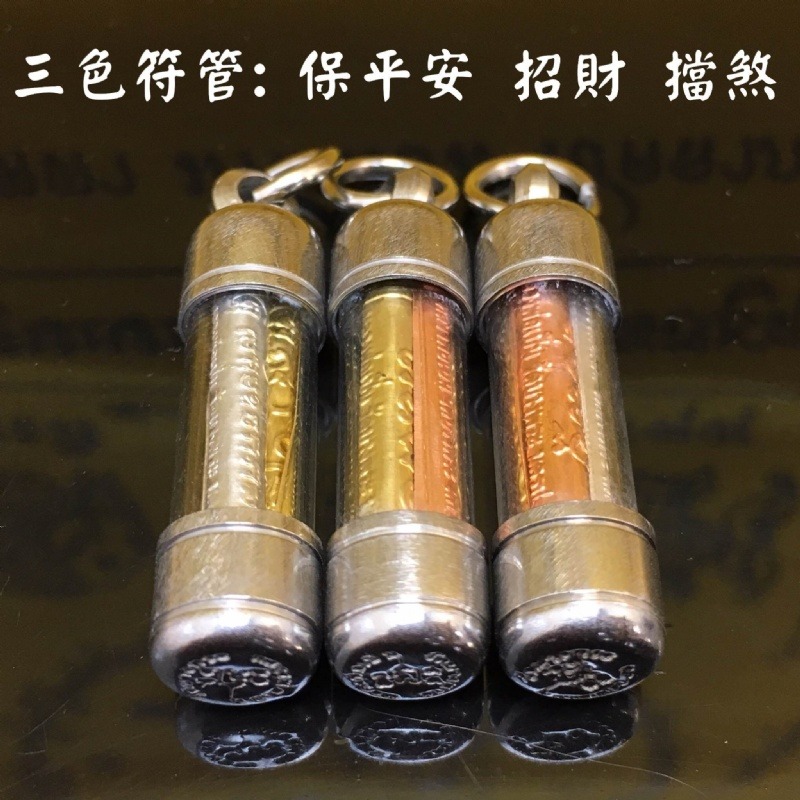 三色符管是一種將經文刻在金屬或錫片上捲起成筒型所製成的聖物,金銀銅三色符管打上招財、人緣、平安等咒語。