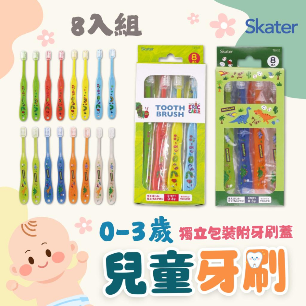 【現貨🇯🇵附發票】日本 Skater 寶寶幼兒牙刷 【0-3歲】恐龍 好餓的毛毛蟲 8入組/獨立包裝/附牙刷蓋