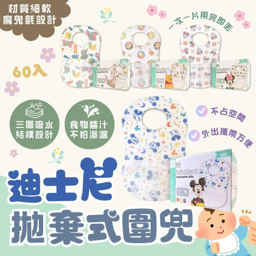 【🎀 2025年新花色】Disney Bibstar迪士尼拋棄式圍兜 60入 吸水防漏三層結構/輕量材質~外出攜帶不占空