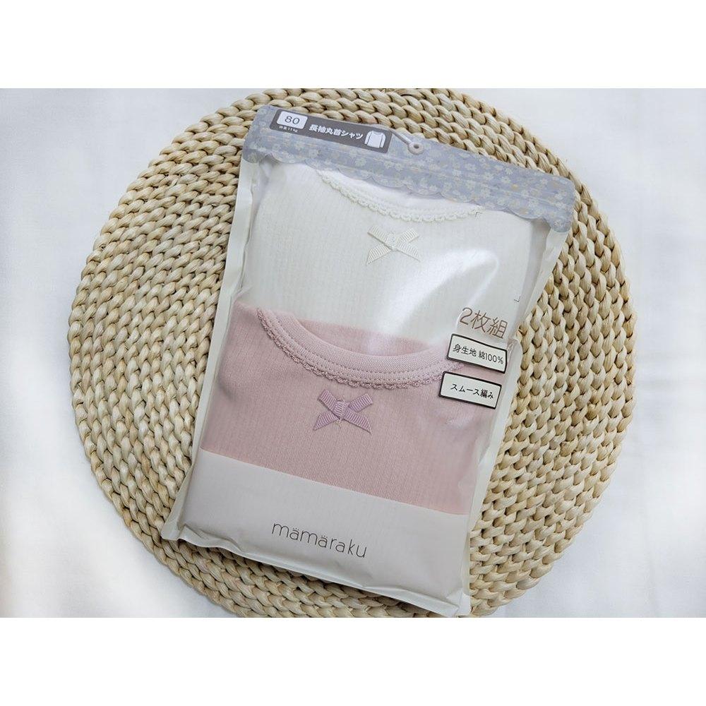 【秋季新品🍭80公分】日本進口 mamaraku 長袖上衣2件組 素面 乾燥粉 白色 蝴蝶結 圓領日本童裝 薄款 內搭