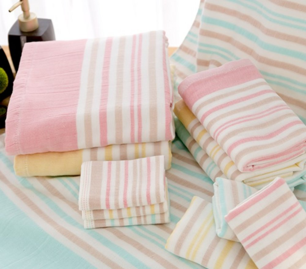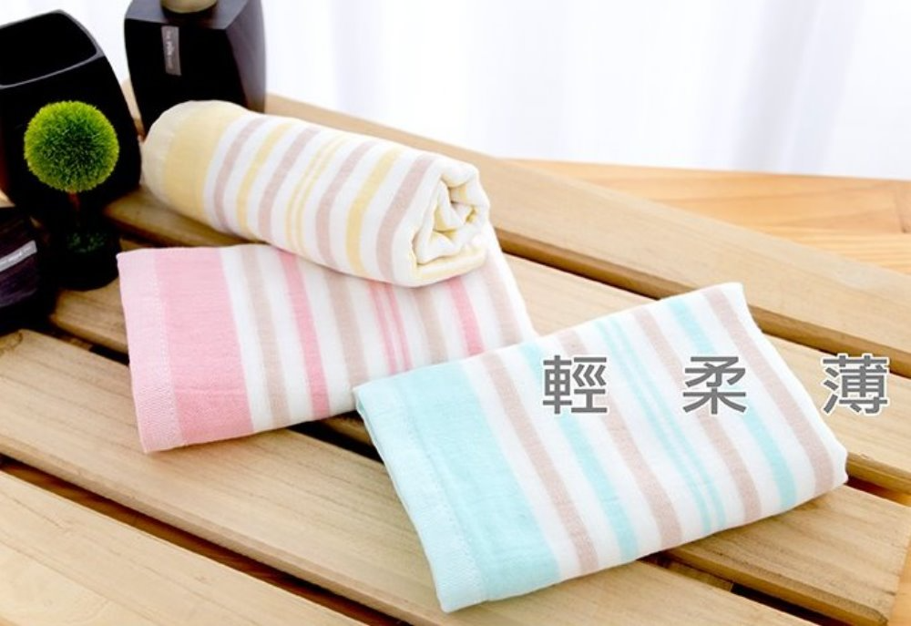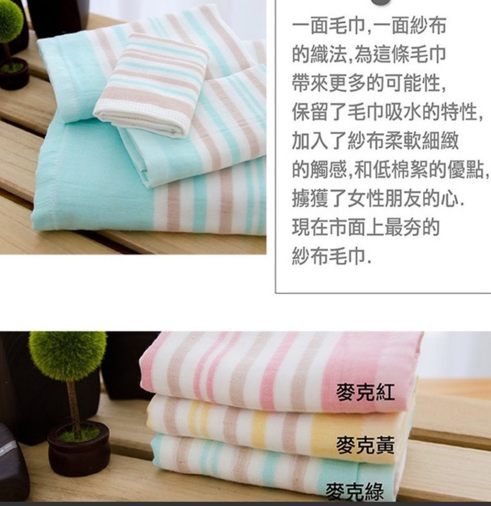 註:尺寸因批次加工,縮幅可能有±5%差異 雙層織造,吸水、快乾!一面毛巾一面紗布的織法,為這條毛巾帶來更多的可能性,保留了毛巾吸水的特性,加入了紗部柔軟細緻的觸感,和低棉絮的優點,擄獲了女性朋友的心,現在市面上最夯的紗布毛巾。