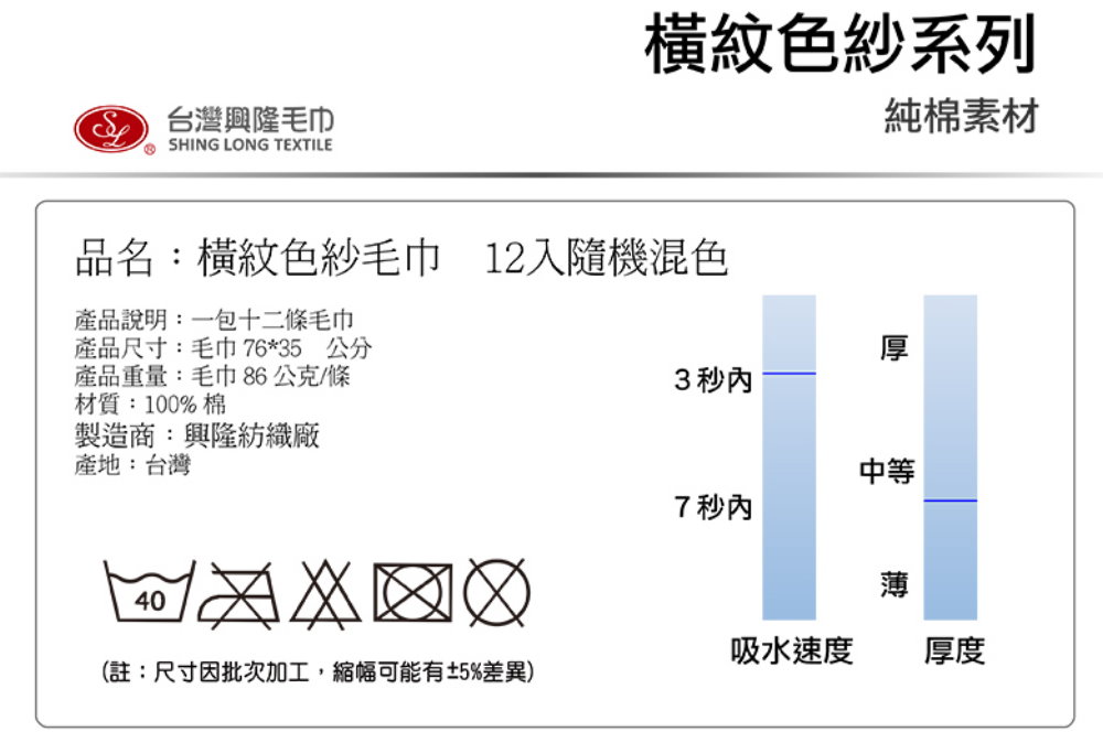 純棉台灣製造,色紗毛巾,輕薄快乾好擰,是您居家的好選擇,一打12入的包裝,滿足大家庭的需求。