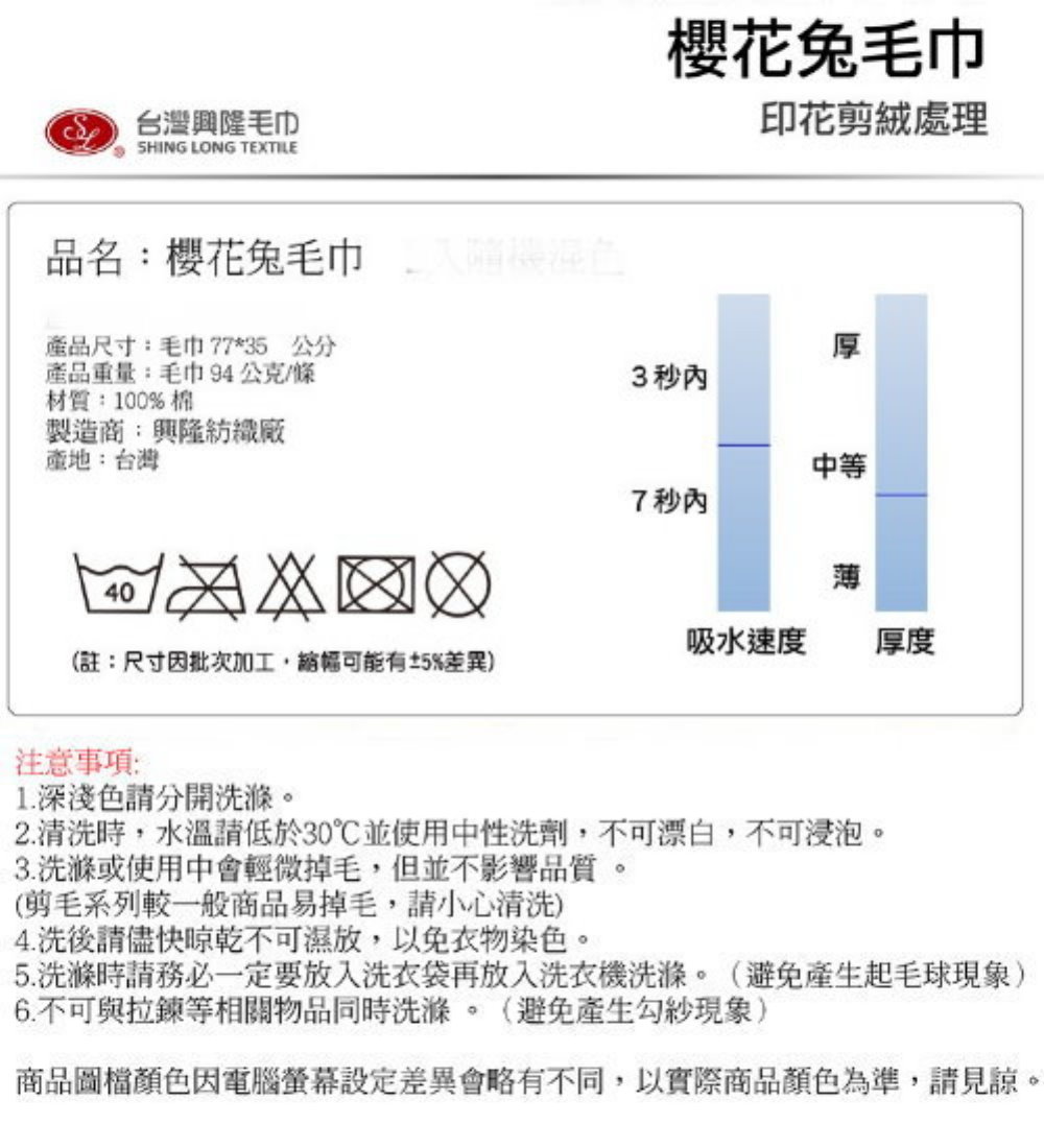 註2:本商品屬於剪絨毛巾,為使觸感更加柔細,在商品表面有做修毛處理動作,因此洗滌過程當中會 有棉絮脫落掉毛的狀況產生,此屬正常現象