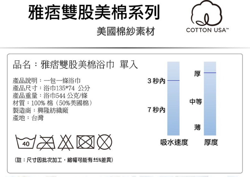頂級20支雙股美國棉紗,六星級飯店等級,六星級飯店的奢華享受。雅痞金/雅痞灰/雅痞紫/雅痞綠。美國棉以機械、自動化生產,生產過程品管嚴格,無其他纖維雜質,棉纖維純度極高。使用美國棉紗製作的產品,柔軟度、吸水性都是優於其他棉紗品牌,且毛巾織物親膚性極高,是許多知名企業指定使用素材。