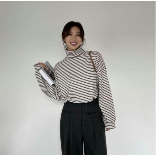 現貨 韓國連線 純棉高領條紋長袖上衣 白底色