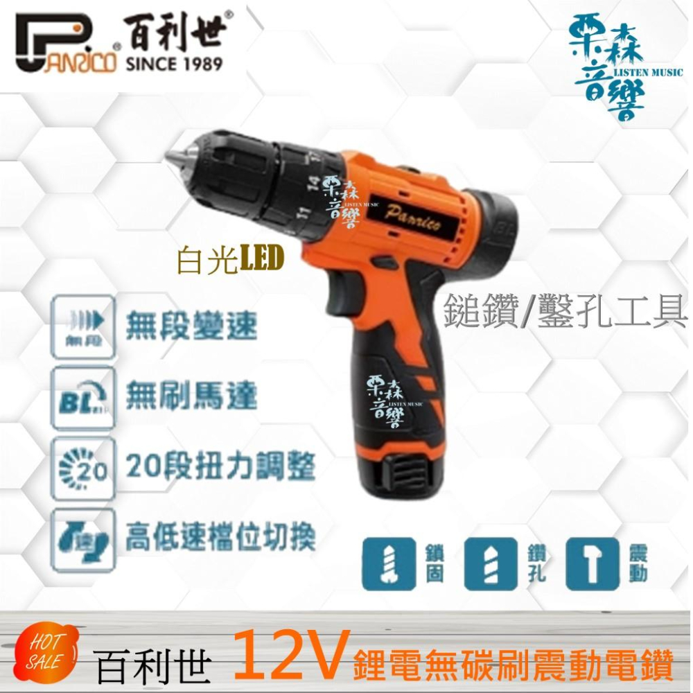 【Panrico 百利世】12V鋰電無碳刷震動電鑽 充電式無刷電鑽 雙電池 電動起子 鎚鑽 BCH-DD12020