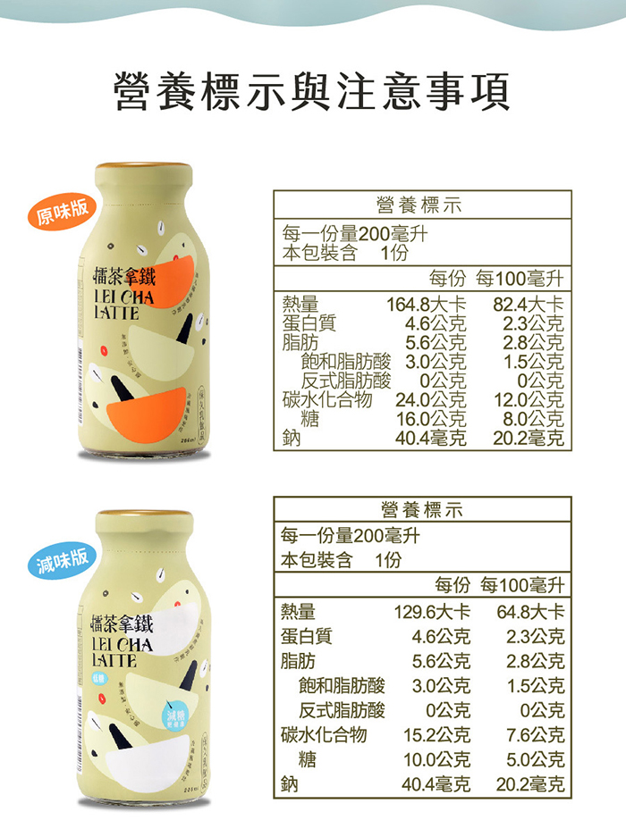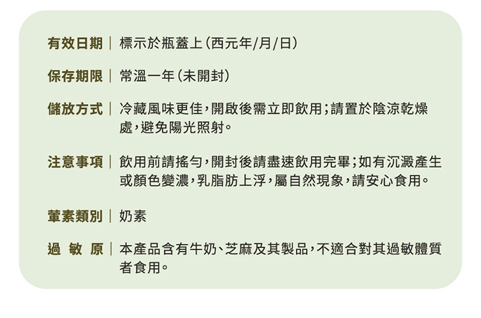 【注意事項】飲用前請搖勻,開封後請盡速飲用完畢;如有沉澱產生或顏色變濃,乳脂肪上浮,屬自然現象,請安心食用。