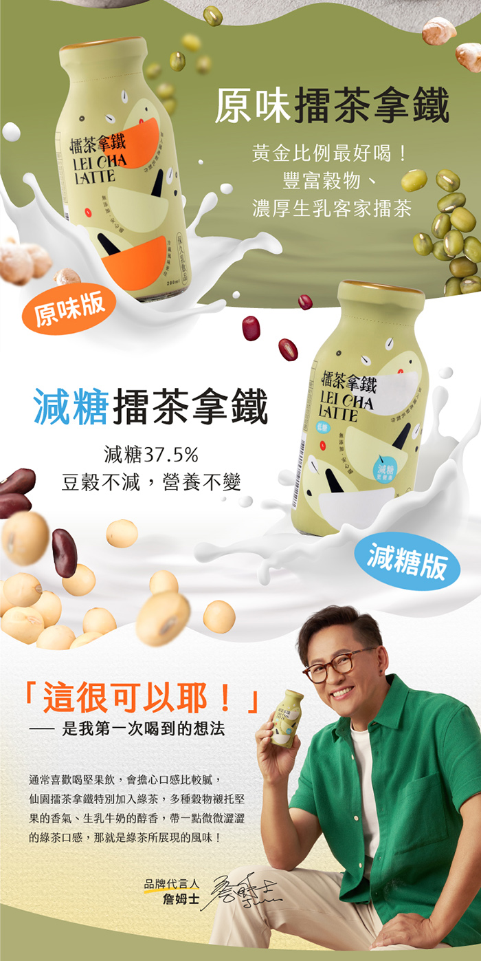 【成分】鮮奶、水、非基因改造黃豆、黑芝麻、白芝麻、綠茶粉、珍珠薏仁、綠豆、紅豆、高梁、小米、花豆、雪蓮子、茯苓、芡實、蔗糖