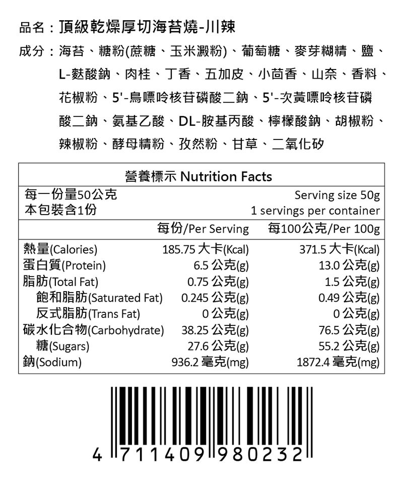 「頂級乾燥-厚切海苔燒」使用嚴選海苔,經過獨特烤製技術,製成一口咬下爽脆的厚切海苔燒,讓您品嚐不同風味的美味。