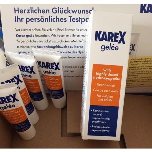 德國原裝進口Karex 免沖洗牙質強化凝膠 德國製造 德國人最愛日常使用產品 德國優秀護齒保健產品 成人/兒童/牙套配戴者/牙齒美白術後保養適用 產品特色: 高劑量牙質再礦化專利保護成分 通過鈣和生物 HAP 再礦化預防齲齒 鈣(BioHAP的關鍵成分)保護牙齒免受細菌和酸值的侵害 用於成人和兒童(從第一顆牙齒開始) 無氟、無糖、純素 成分富含Karex活性成分BioHAP*以天然牙釉質的主要成分為藍本。定期使用支援牙釉質受損區域的再生,並形成保護層。 為什麼推薦使用這一款產品? 一般我們在刷牙時,如果力道拿捏掌握的不好.很有可能會傷害到牙齒表面的琺瑯質.造成琺瑯質受損. 當琺瑯質損耗時,會產生蛀牙、還有牙齒對冷熱敏感,甚至是牙齒感染的情況。 琺瑯質也會因牙菌斑的細菌、以及大量糖分和酸性物質而受到侵蝕,形成蛀牙。 德國人他們習慣在刷牙完後.晚上睡前,沾取這款產品約水珠大小的用量塗抹在牙齒上做保護. 用夜間睡眠的時間強化+再礦化牙質.讓牙齒強壯. 平常他們也會選擇含有牙質再礦化專利保護成分的牙膏.做清潔+保護+再礦化強化牙質^^ 這是一款非常好的產品. 使用時只需沾取一點點的用量,塗抹在牙齒上.就能完美達到保護+強化的作用^^ 減少看牙醫的次數^^ 除了刷牙後的特殊預防外,Karex凝膠也適用於 牙套配戴者. 牙齒美白後 MIH患者: 具有MIH(磨牙門牙低礦化)的牙齒沒有完全礦化的牙釉質. 使用方式: 每天用手指或軟牙刷刷牙(僅塗抹,請勿刷牙)後塗抹在牙齒上. Karex果凍凝膠留在上面的時間越長,牙釉質再礦化的效率就越高。 建議在晚上刷牙后塗抹,保持過夜。通過這種方式達到最優秀的效果。