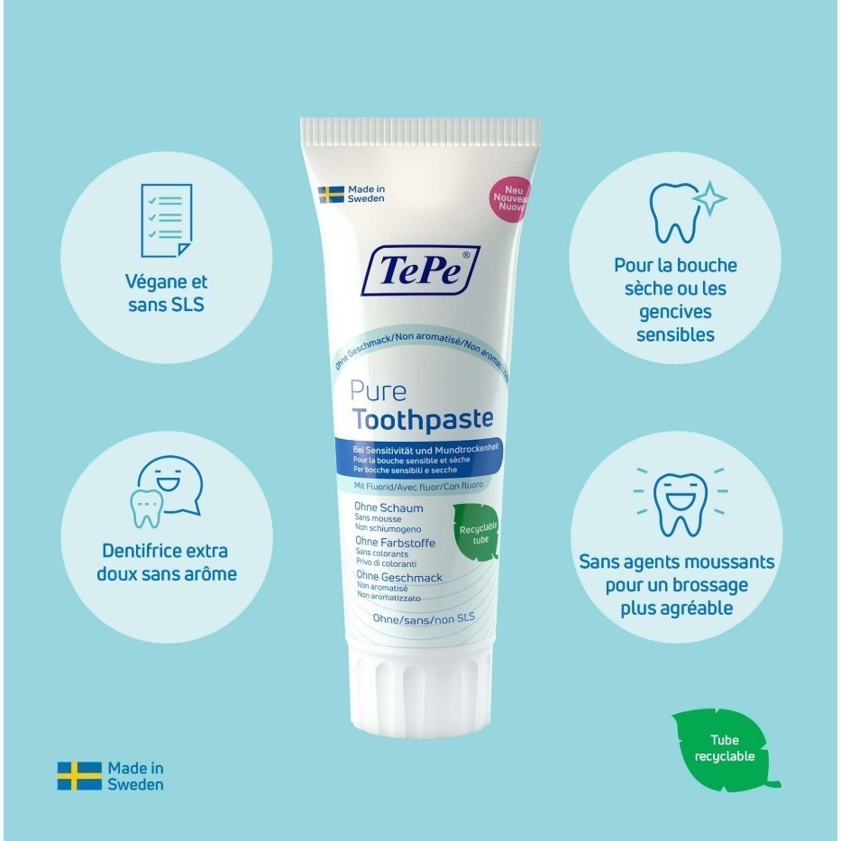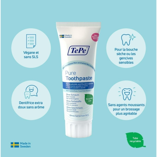 • 適用於非常敏感的牙齦和口幹:TePe Pure 無味牙膏是一種含氟牙膏,適用於牙齦非常敏感和口幹的人.沒有添加香料和不起泡的特性。