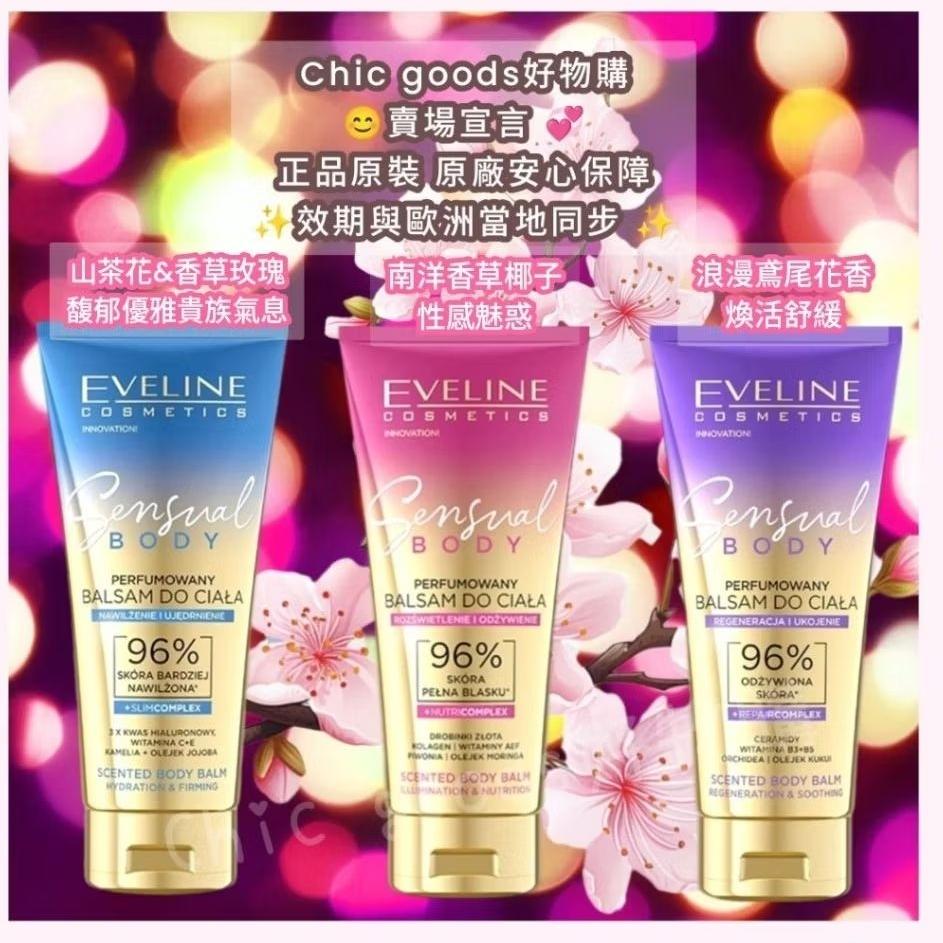 (正品)歐洲EVELINE性感香氛身體乳 歐洲製造 /原裝 榮獲歐洲美體美容大獎 原廠說明: 保濕緊緻 煥活舒緩 光彩滋潤 非常適合日常護理。質地輕盈舒適,不會給肌膚帶來負擔。 每次使用都如同片刻的停頓和靜心——即使在緊張的一天中也能呵護自己。 容量: 原廠瓶身標示200mL 效期:最新效期