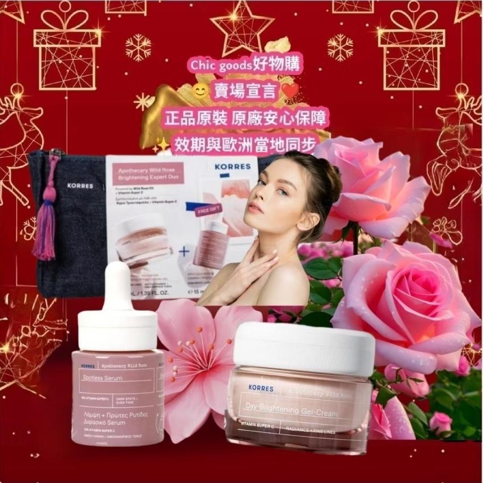 (正品)現貨希臘原裝KORRES野玫瑰淨白煥采日霜+野玫瑰無暇精華+限定化妝包