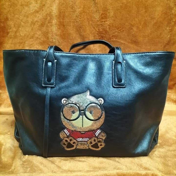專櫃奶油熊亮片牛皮黑色軟皮托特包質感很好尺寸-(37x29x15)內裡有 隔層滿版印花