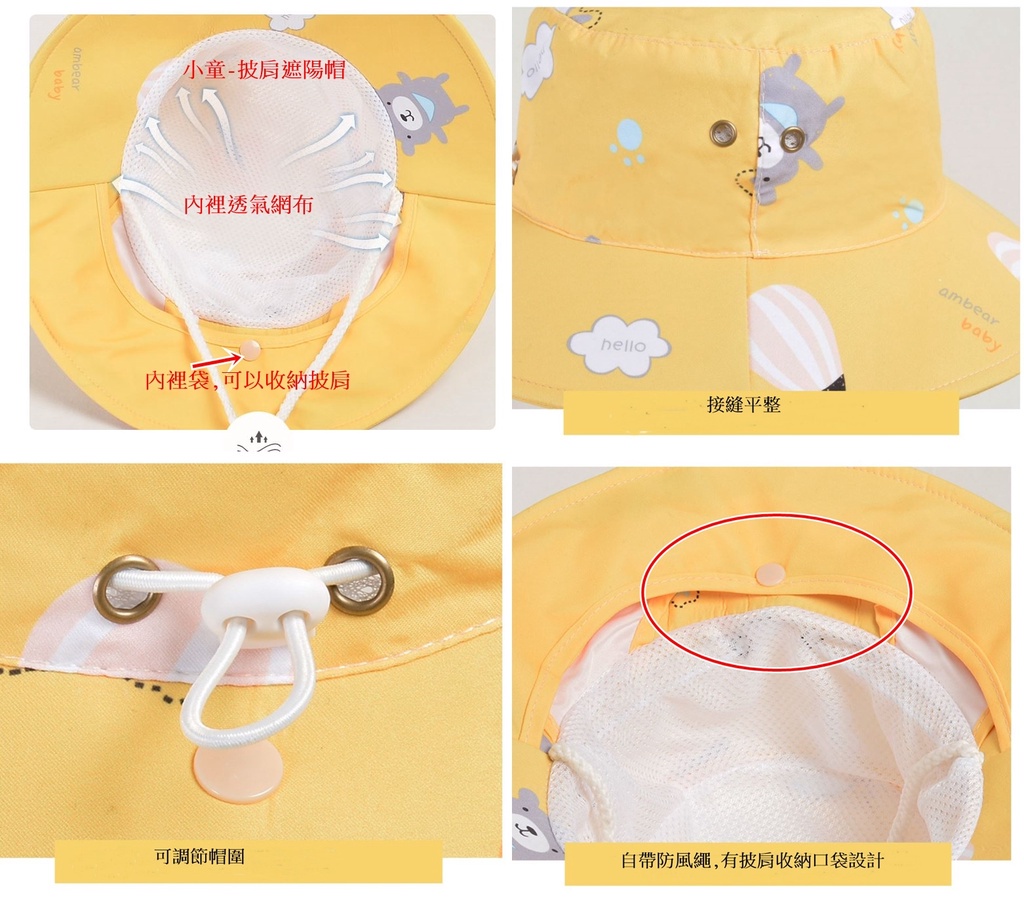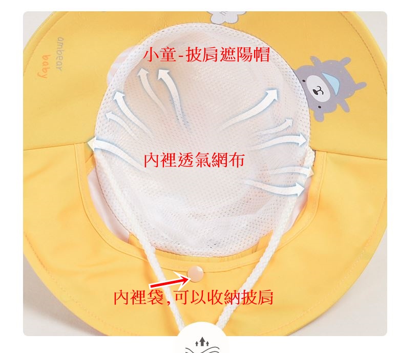 1.透氣網布,帽子後方有收納袋,可以收納披肩後變純帽子.