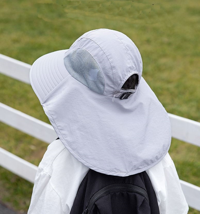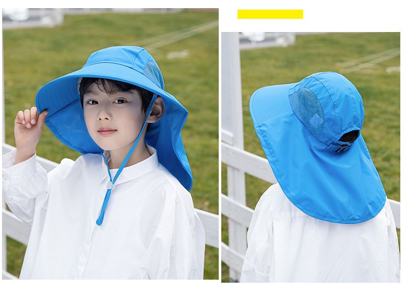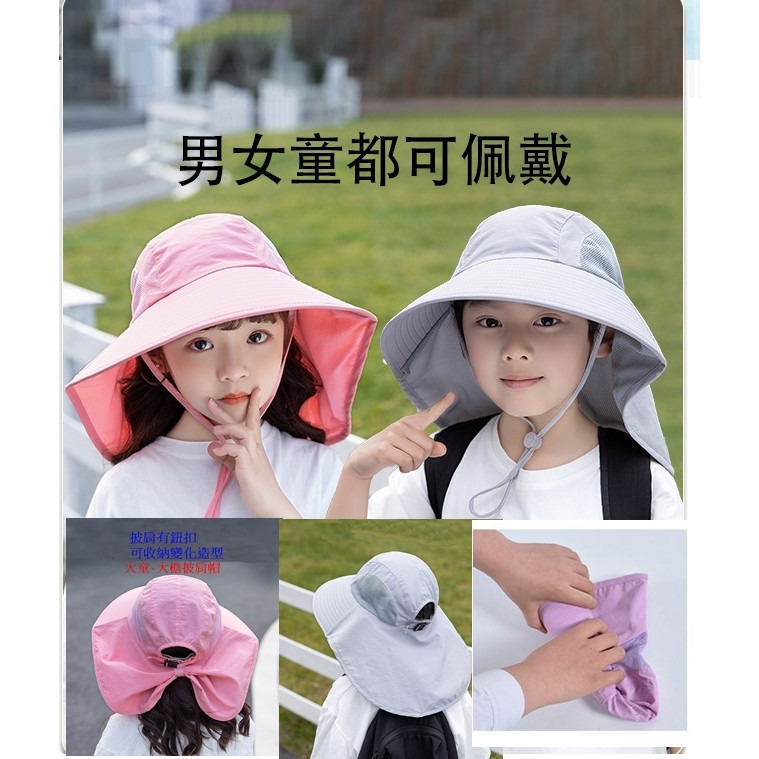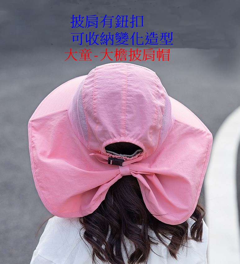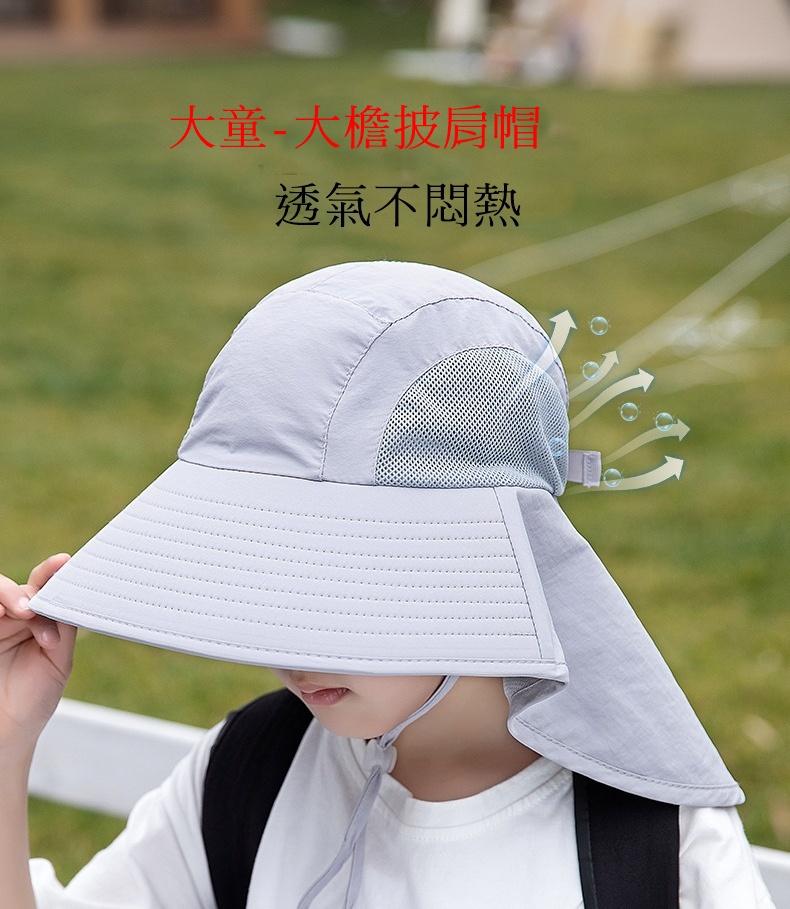 ➡️ 大童遮陽帽: 加大帽檐及加長披肩(連體設計,無法拆開,後方有鈕扣帶,可以收折披肩)