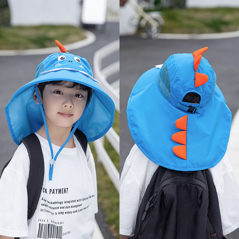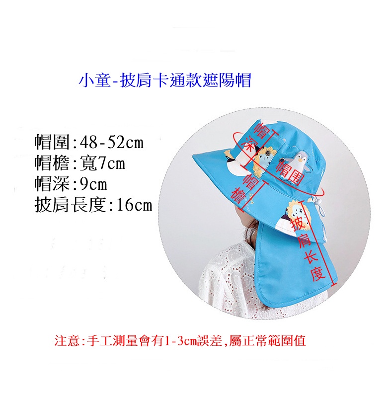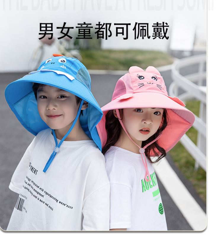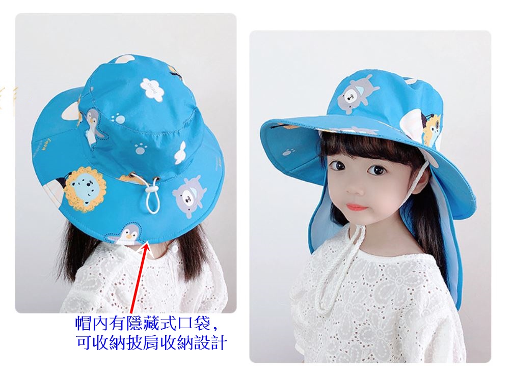 ➡️ 小童遮陽帽: 卡通款帽檐及加長披肩(連體設計,無法拆開,後方有隱藏收納袋,可以收納披肩)