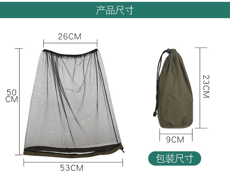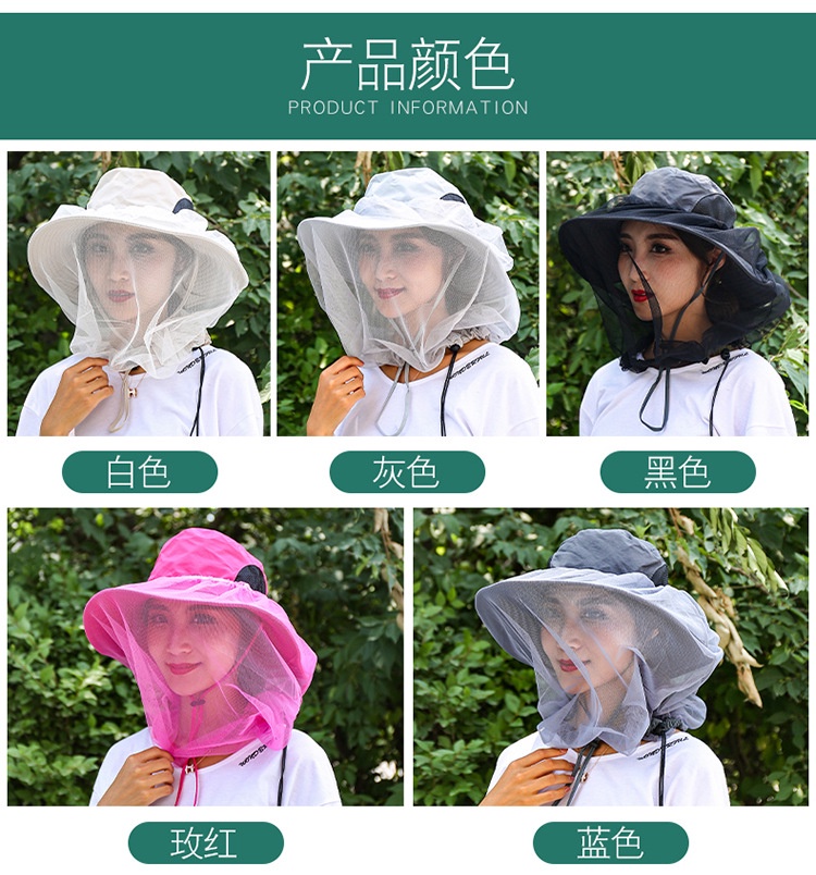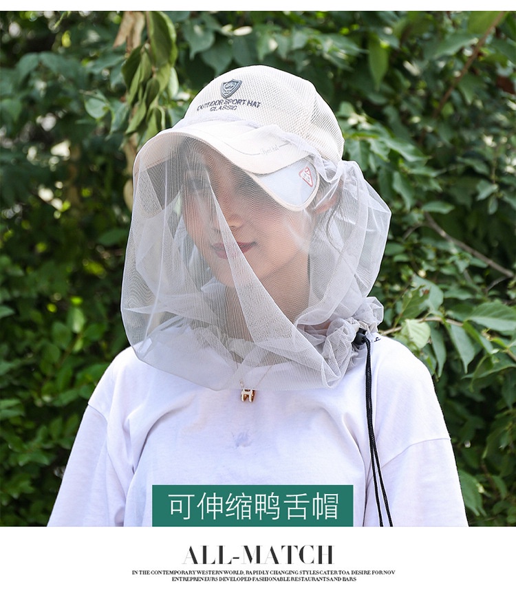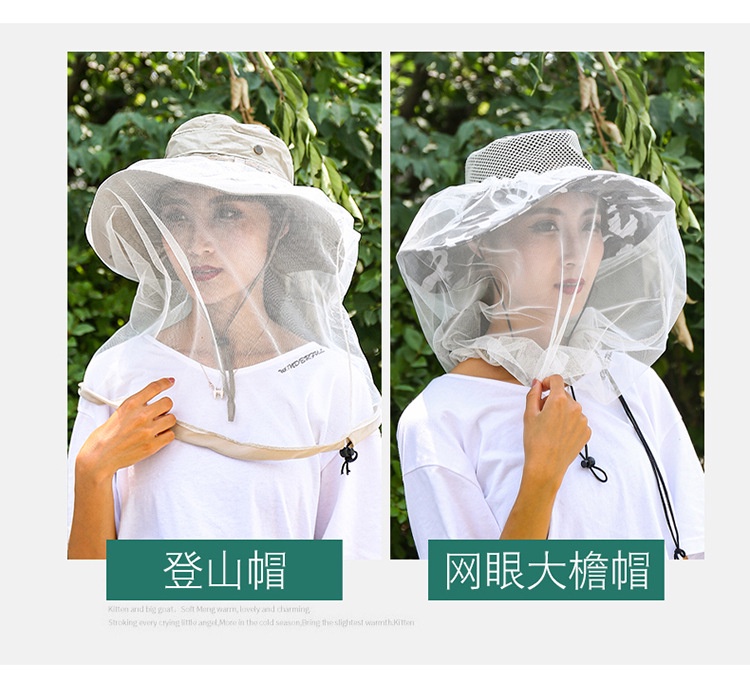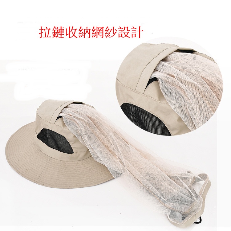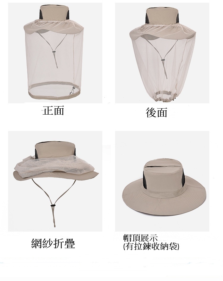帽子內附頸繩,紗網底部有束口繩,以防蚊子穿入.