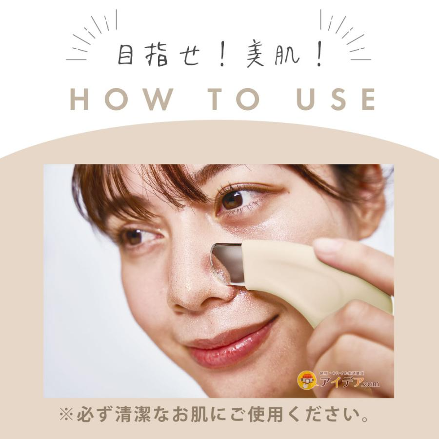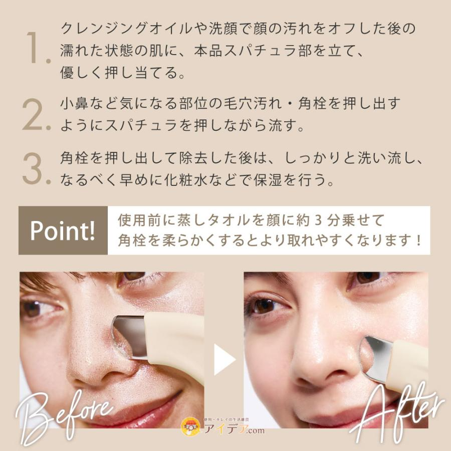 1.用卸妝油或洗面乳清除臉上的污垢後,將本品的刮刀部分放在濕潤的皮膚上,輕輕按壓。
