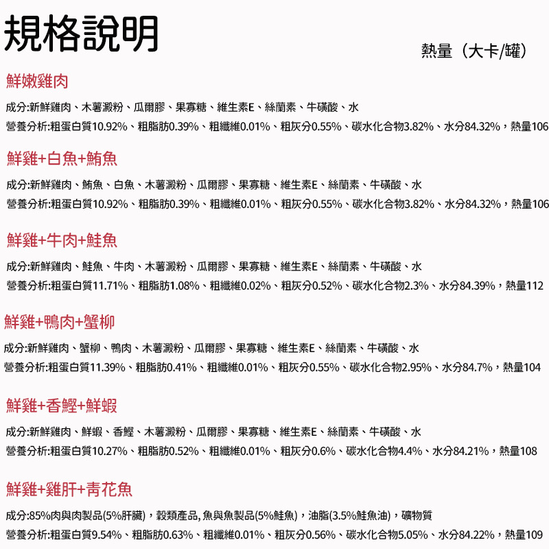 鮮嫩雞肉、鴨肉、蟹柳、木薯澱粉、瓜爾膠、絲蘭素、果寡糖、牛磺酸、維生素E
