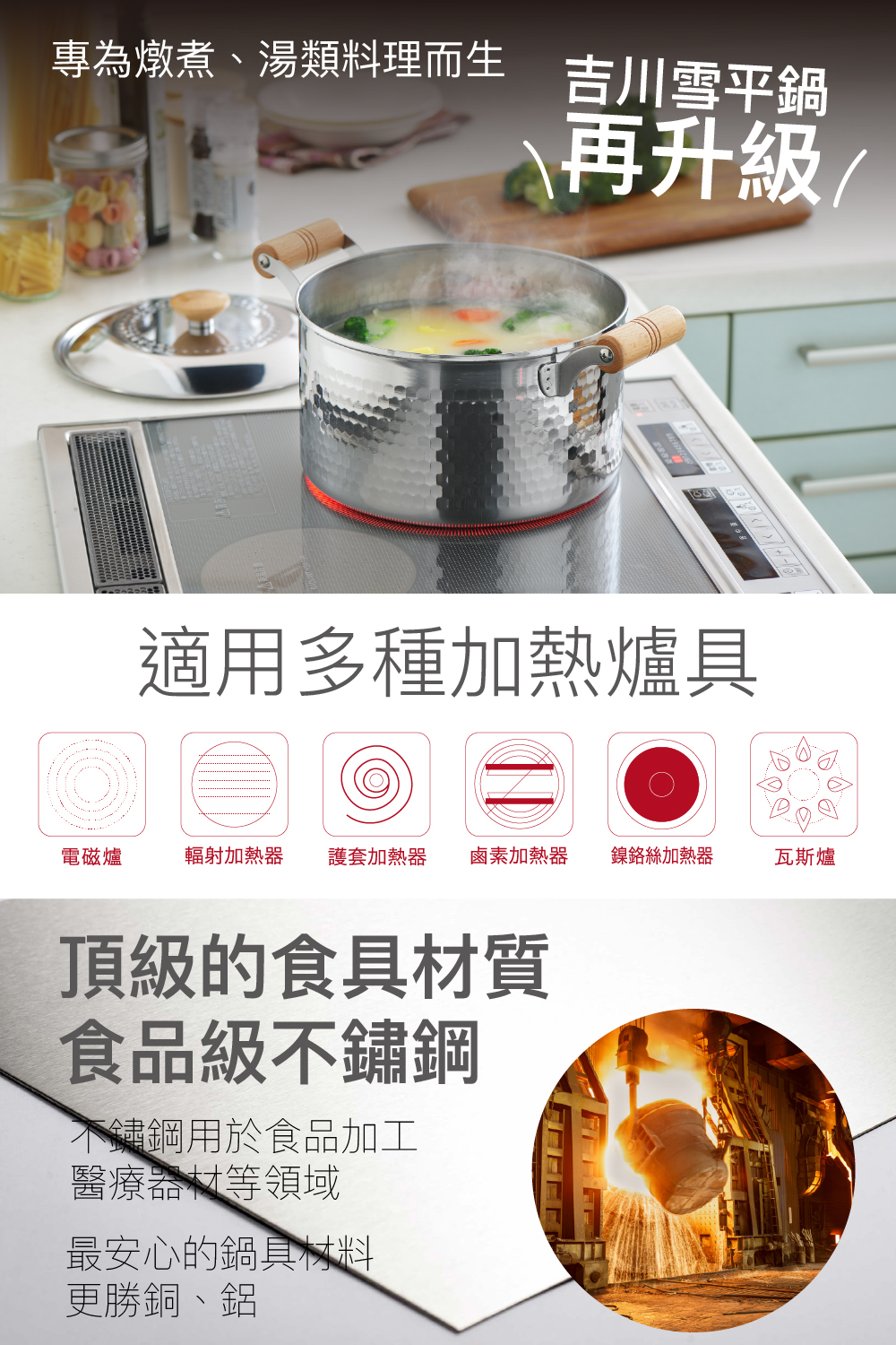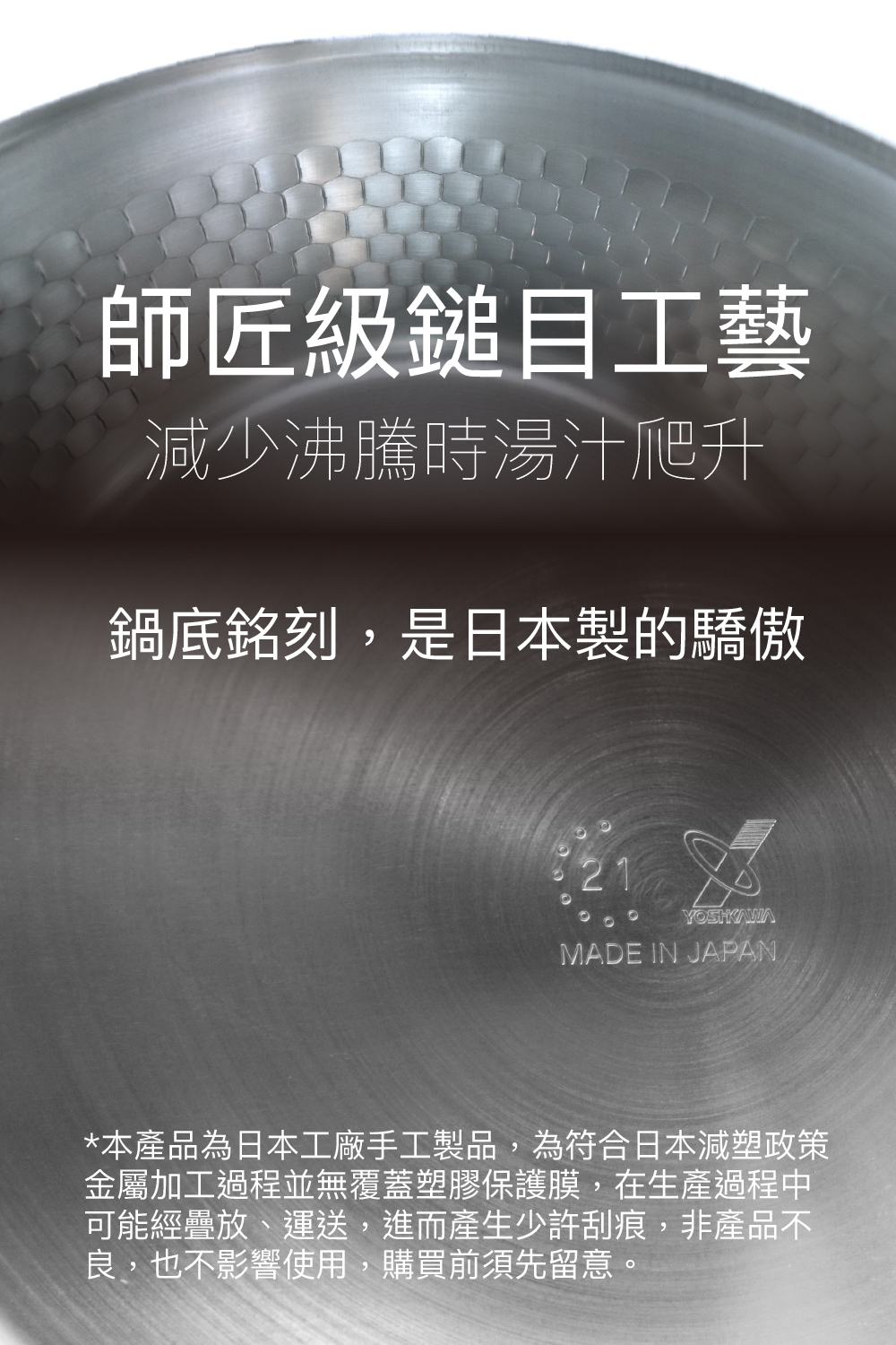日本製造食品級不鏽鋼打造,真空焊接無卯釘設計,IH爐、電磁爐、瓦斯爐都可安心使用的萬能鍋具!日本師匠級手工鎚目工藝,只有吉川雪平鍋,才不愧雪平鍋之名!