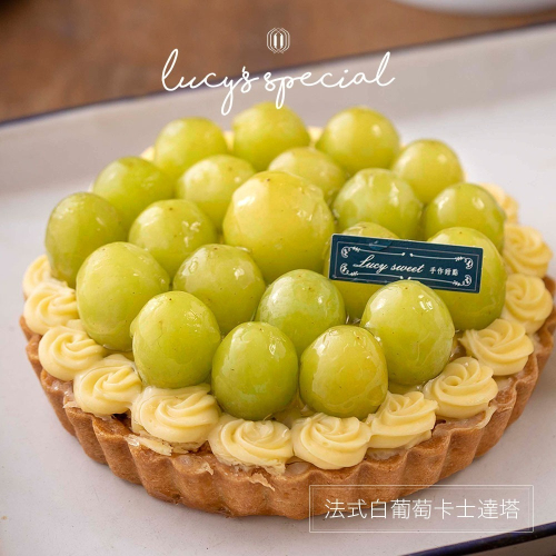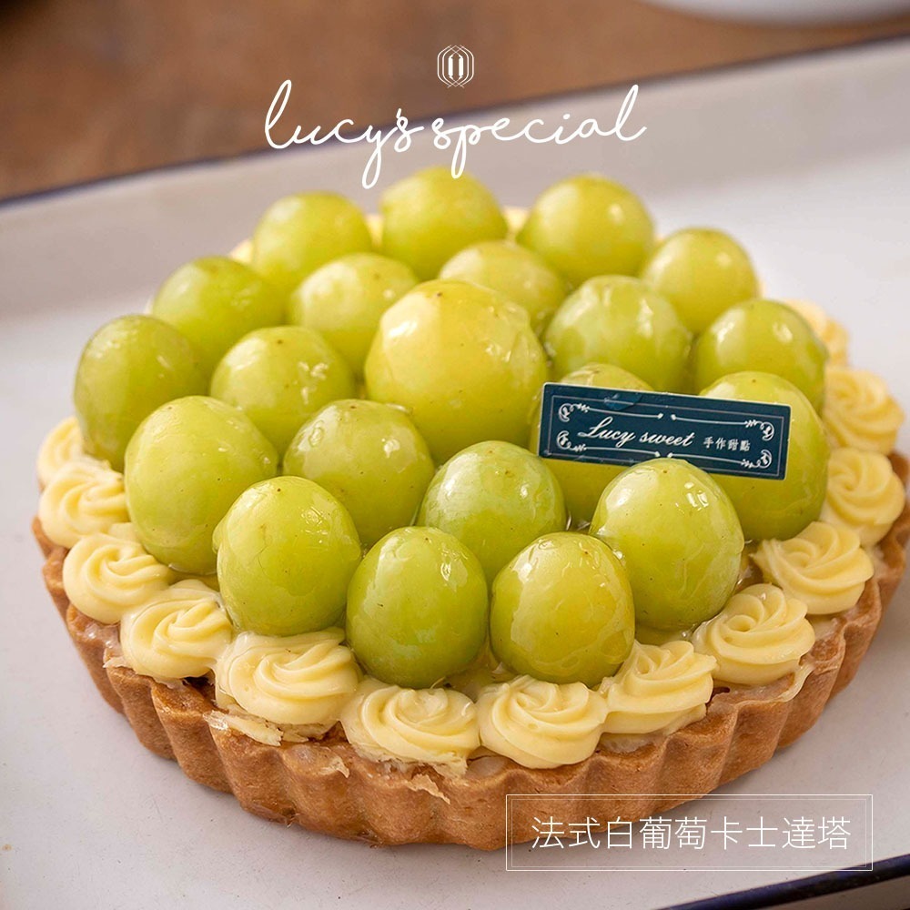主廚在塔面淋上濃郁可口的干邑卡士達醬,再以新鮮綠葡萄點綴。