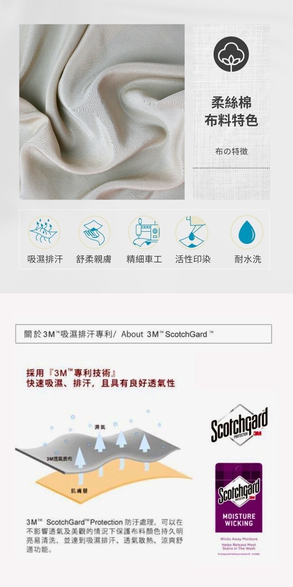 表布使用3M Scotchgard吸濕排汗,清透不悶熱,防皺效果佳!布料可以迅速排出濕氣,抑制細菌易去髒污並具有良好的透氣性,觸感平滑輕柔,透氣舒適活性印染好健康,不易退色!