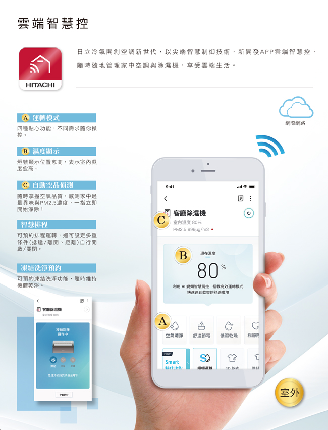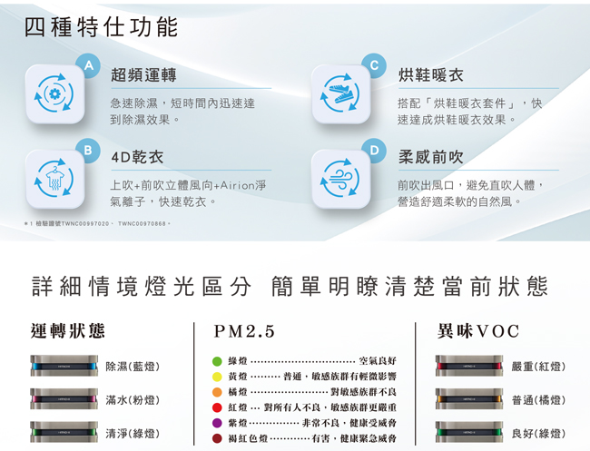 機體運轉狀態:除濕(藍燈)、滿水(粉燈)、空清(綠燈)、凍結洗淨(間歇黃燈)