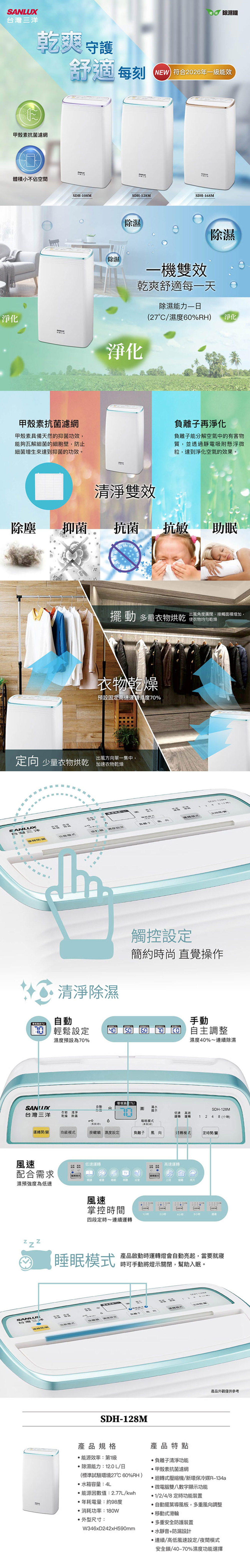 *連續/高低風速設定/夜間模式/安全鎖/40-70%濕度功能選擇