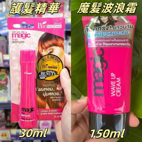泰國 Bio Woman 粉色奇蹟 護髮精華 魔髮波浪霜 **護髮精華30ml: 頭髮容易毛躁! 太乾燥不美麗 泰國Bio Woman粉色奇蹟 護髮精華 修復受損秀髮,增加秀髮質感光澤,減少損傷 隨身攜帶, 潤髮,養護,除臭 直接塗抹於秀髮上不須沖洗非常方便喔^^ **魔髮波浪霜150ml: 泰國 Bio woman 魔髮波浪霜 專為燙過捲曲髮型設計 可增加秀髮蓬鬆感 讓燙過的捲髮呈現波浪螺旋 只要塗抹後用手揉搓頭髮或瀏海並將其抬起即可 也可以搭配電棒 捲髮器加強捲曲度喔!!