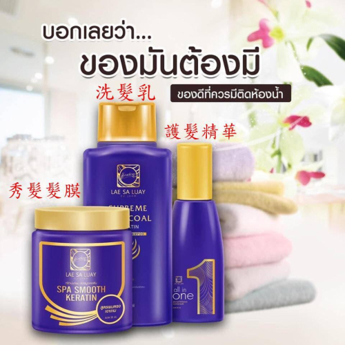 泰國美容院專用秀髮髮膜~新包裝 加強新配方!!!!平民價 專櫃品質,在泰國各大美容院都會看到,深受泰國女生喜愛,能滋潤秀髮,對於染燙後的秀髮很好用喔! **LAESALUAY洗髮乳,能增加秀髮柔順,改善秀髮毛躁、並修護髮尾,使頭髮易於梳理 **all in one護髮精華,免沖洗,補充秀髮水分,改善乾燥髮質,使秀髮柔順有彈性 三罐一起搭配使用更好喔^^ 各位美女媽媽們就算平常再忙, 也要保持秀髮亮麗喔!!這瓶超推薦!!!! 絕對超值 **規格: 秀髮髮膜:250g 洗髮乳:200ml all in one護髮精華:50ml