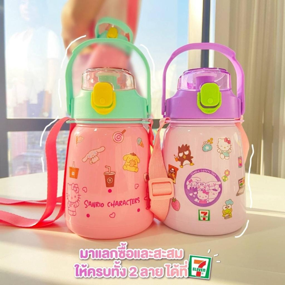 泰國711新推出”三麗鷗大容量水壺 保冰壺” ”大肚瓶身” 設計,大容量滿足日常飲水需求 按壓式彈跳壺蓋附有提手和背帶方便攜帶 🚶🚶‍♂️🚶‍♀️ 隱藏式軟吸管讓您喝水超方便 每個水壺都附贈三麗鷗貼紙,讓您可以貼在水壺上 自己創造出自己喜歡的水壺圖案 超級限量超級難買,喜歡手刀要快喔 晚一步就會被搶光喔!! 兩色可以選 -粉色 -紫色 **規格:32oz(946ml) **材質:塑膠