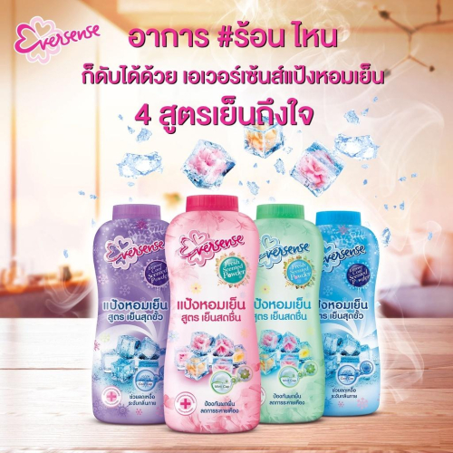 泰國Eversense冰酷爽身粉 讓您冰酷一夏 採用薄荷膠囊技術,香氣持久 提供長時間涼爽和清新 共有四款可以選擇: -紫色:桃子香 使肌膚看起來光滑、柔嫩、年輕 -藍色:薄荷香 極清涼配方,留香持久,長時間保持涼爽 -粉色:清新花香 提供長時間涼爽和清新 -綠色:清新花香 消除臭味,維持長時間清涼舒爽 **規格:280g
