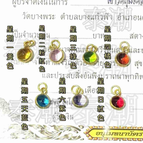 泰國 龍婆本廟 轉運珠 水龍珠 生日石 泰國人注重色彩學,每一天都有各自的顏色為代表 根據泰國人的信仰,每週7天各對應1顆星,並有其守護神, 7天的7種顏色與名稱就是源自各守護神的名稱與其顏色 生日石屬於全方位的聖物,能保佑您招好運來,壞運去,招財富、招桃花,招健康,避小人招貴人為您帶來好運! **以西元生日當天星期幾: 星期一:守護神「月神」,代表色是黃色 星期二:守護神「火星神」,代表色粉紅色 星期三:守護神「水星神」,代表色綠色 星期四:守護神「木星神」,代表色橘色 星期五:守護神「金星神」,代表色天藍色 星期六:守護神「土星神」,代表色紫色 星期日:守護神「太陽神」,代表色紅色 **規格:直徑約1cm