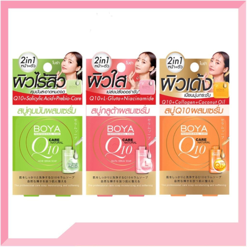 泰國 BOYA Q10 精華皂 幫助滋潤肌膚,維持肌膚油水平衡 讓您從洗臉洗澡開始保養您的肌膚 共有三款可以選擇: -黃色Q10 -綠色茶樹精油 -粉色穀胱甘肽 **規格:100g