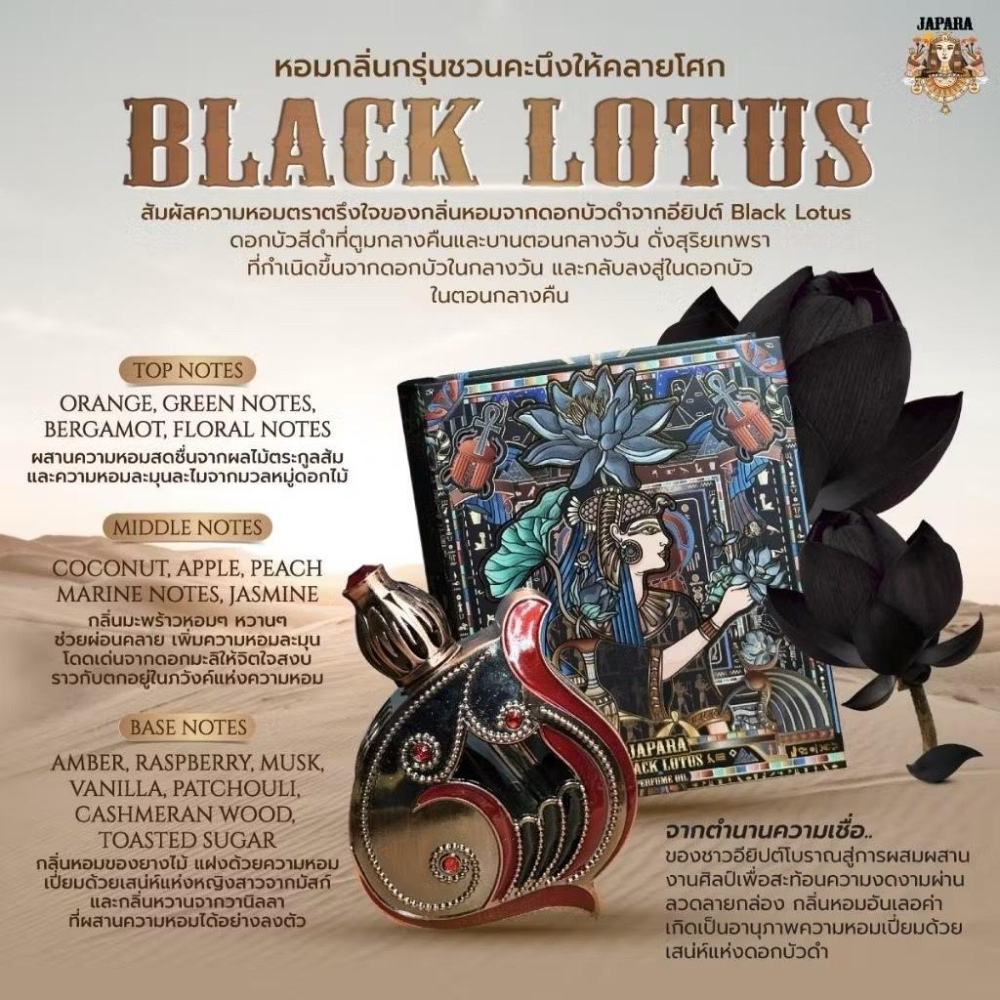 ⭐️⭐️下單前請注意一下,因為國際空運難免會有小碰撞,所以外層封膜有可能會碰撞到有小缺損但不影響裡面商品,而且收到商品後客人也會把封膜拆開來使用,故商品主體有問題可以退換貨。但外層封膜不屬於退換貨範圍,能接受在下單喔,謝謝您!! ⭐️⭐️黑蓮花改版囉,瓶身外盒都一樣只有更改香味,全新香味讓您一聞就愛上!! 泰國 JAPARA 黑蓮花 BLACK LOTUS 來自埃及神秘的黑蓮花,象徵著"只有開始,不會幻滅"的永恆之愛 將您帶入一個充滿奇幻和誘惑的香氛世界 清新的佛手柑與柑橘香味融合了茉莉,覆盆子的甜美 最後由香草、麝香誘惑神秘的香味結尾 讓您倘佯在幸福的愛情之中久久不能自拔 👉🏻前調:柑橘、青香、佛手柑、花香 將柑橘類水果的清新香氣與溫和的花香完美結合 👉🏻中調:椰子、蘋果、海洋香、茉莉、桃子 椰子的甜美再加上溫和清新的茉莉花香,彷彿置身於芬芳的伊甸園中 👉🏻基調:琥珀、覆盆子、香草、麝香、廣藿香、烤糖 琥珀的香氣充滿著魅力的誘惑融合著覆盆子和香草的甜美香氣 ⭐️規格:8ml