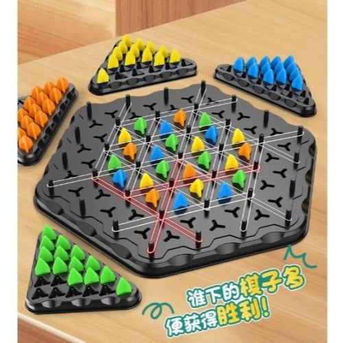每位玩家都有21顆棋子,通過皮筋套住柱子形成三角形,形成的三角形就可以放一顆自己的棋子,誰先把自己的棋子放完誰就贏了。
