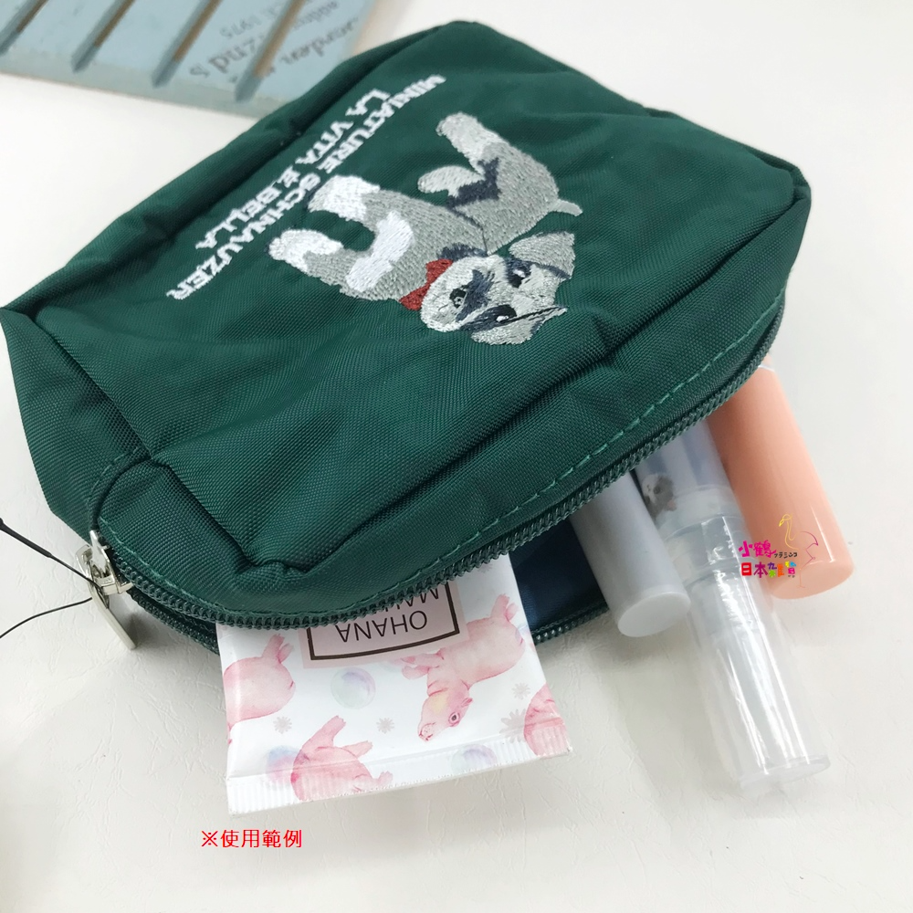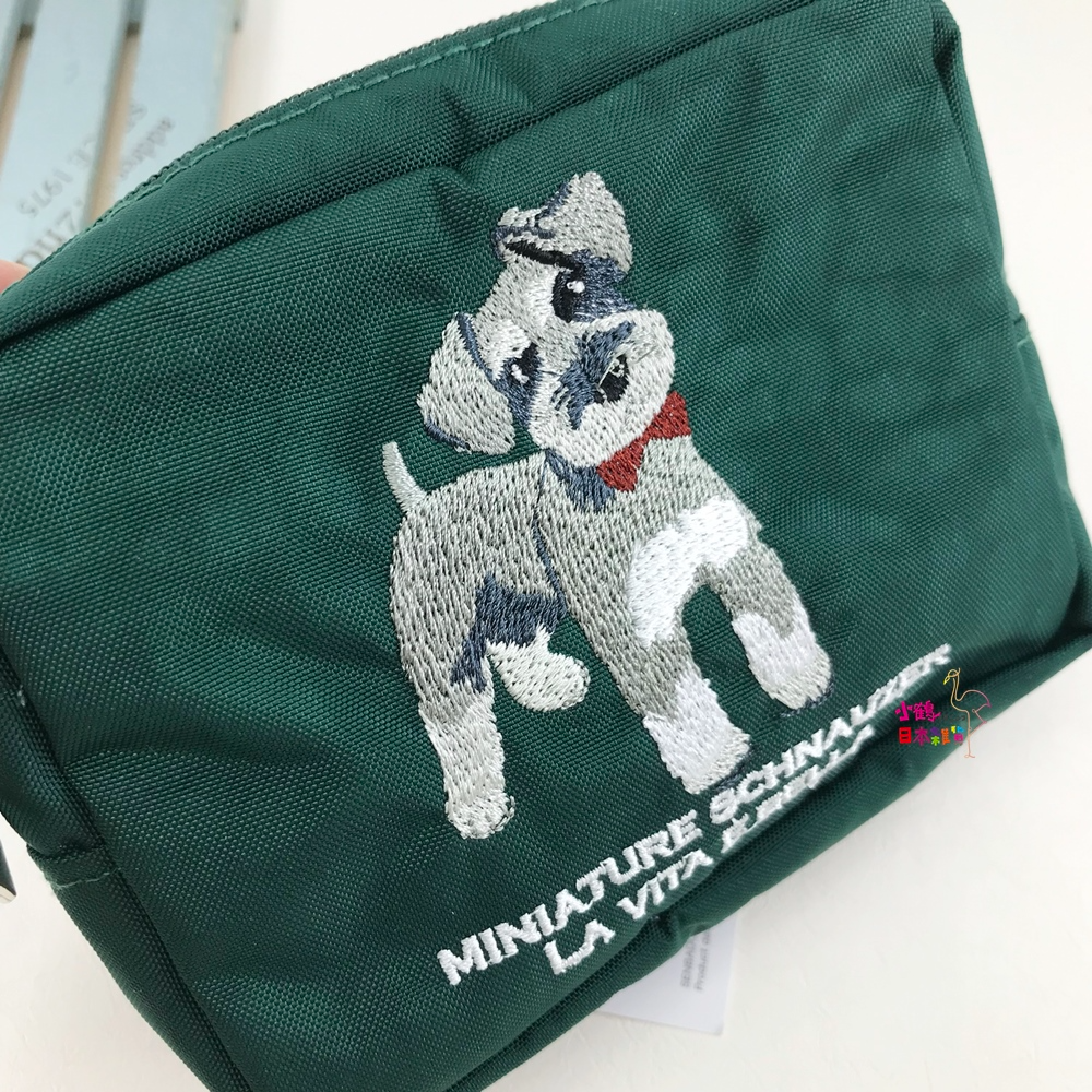 日本 polkapolka 動物刺繡 防潑水 化妝包 多用途收納包(綠色/雪納瑞)|小鶴日貨