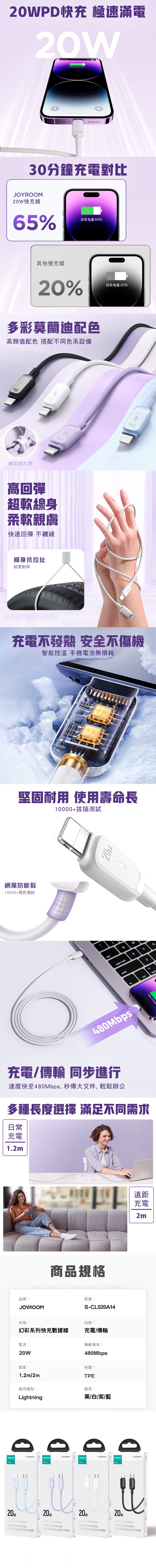 JOYROOM 幻彩系列 PD快充 20W Type-C to 蘋果 20W 1.2M USB-A to 蘋果 充電線