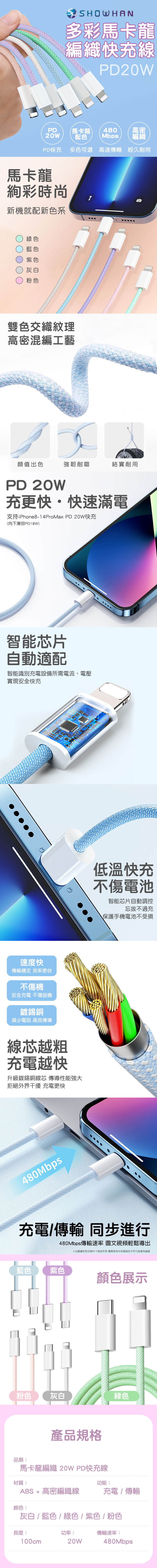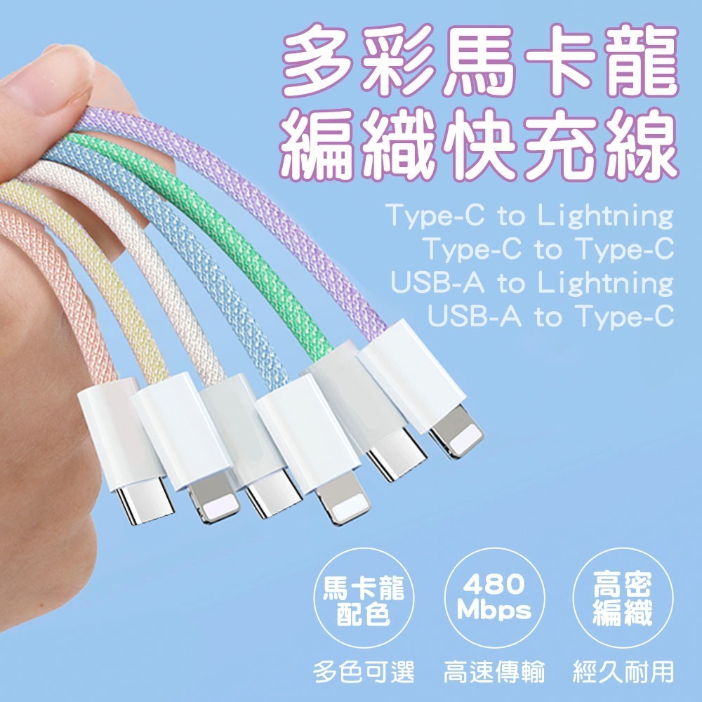 SHOWHAN 馬卡龍編織 充電線 適用 安卓 Type-C 蘋果 20W PD快充 2.4A 充電線適用iPhone
