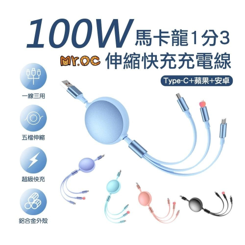 Mr.OC 100W 馬卡龍1分3伸縮快充充電線 USB-A to 平果/MicroUSB/Type-C 1.2M