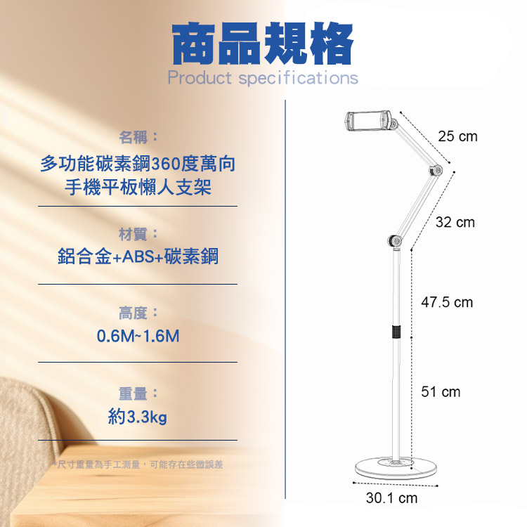 名稱:多功能碳素鋼360度萬向手機平板懶人支架