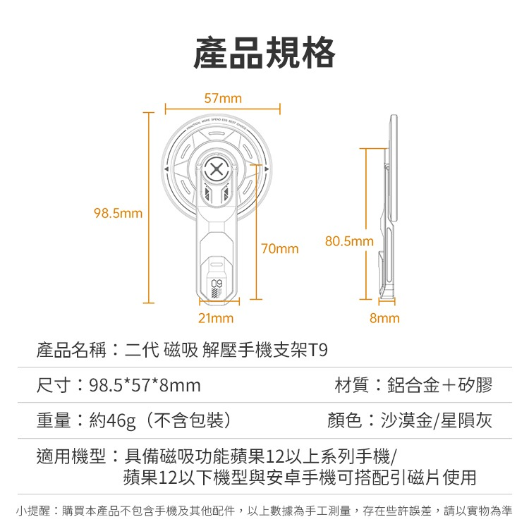適用機型:具備磁吸功能蘋果12以上系列手機/蘋果12以下機型與安卓手機可搭配引磁片使用