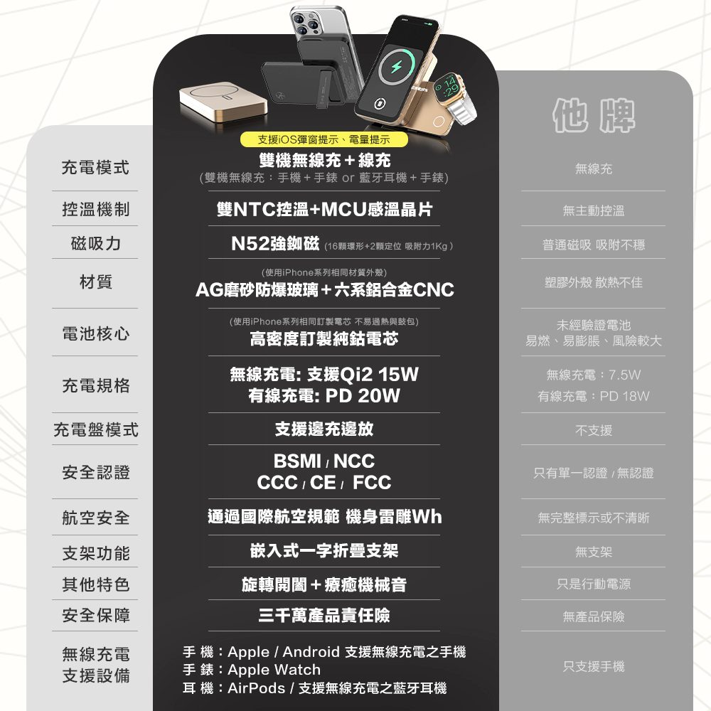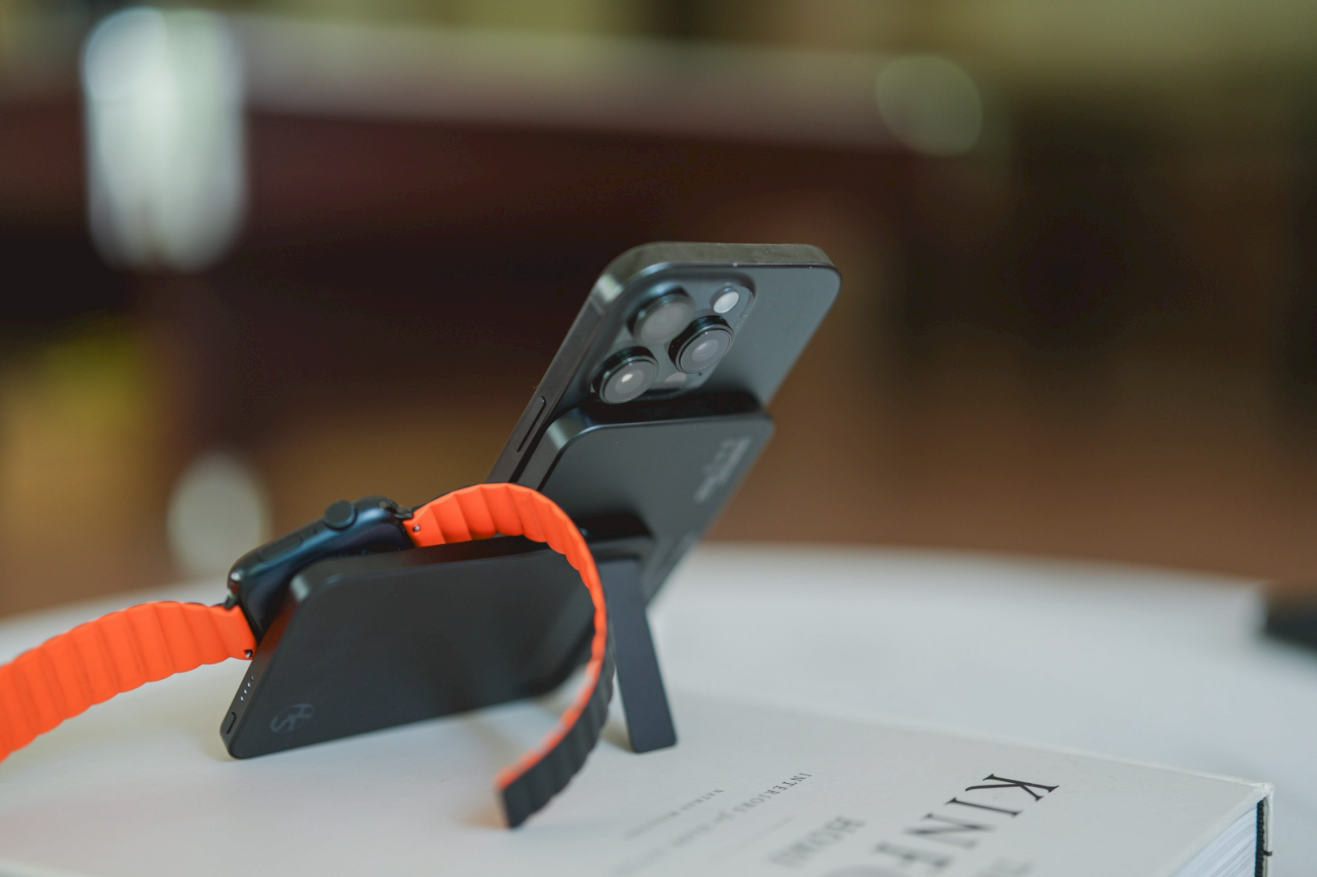 一顆電源,滿足你日常所有充電需求,收納好攜,支援iPhone MagSafe、Apple Watch、耳機與手機支架模式。